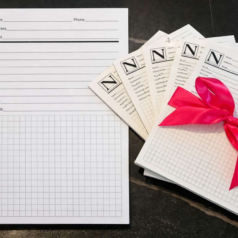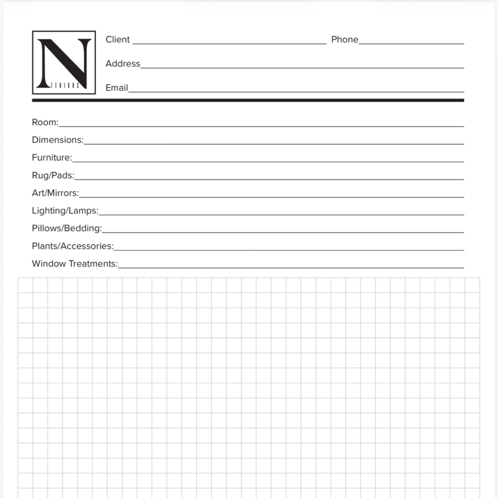 The N-teriors Room Design Planner is created for interior designers and home styling projects to capture measurements, furnishings, accessories, and layout ideas during client visits.